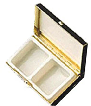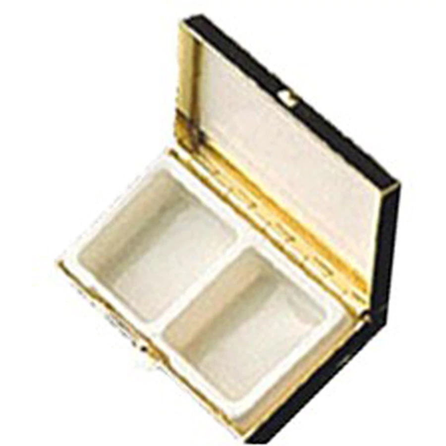 Fényes aranyszínű, kétrekeszes gyógyszertartó.
