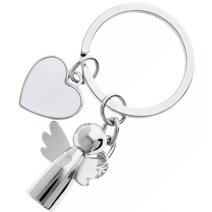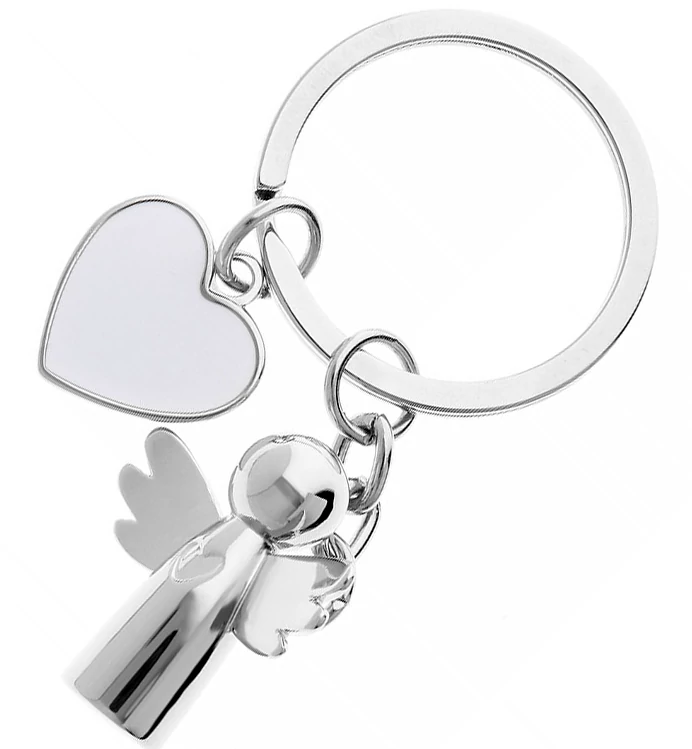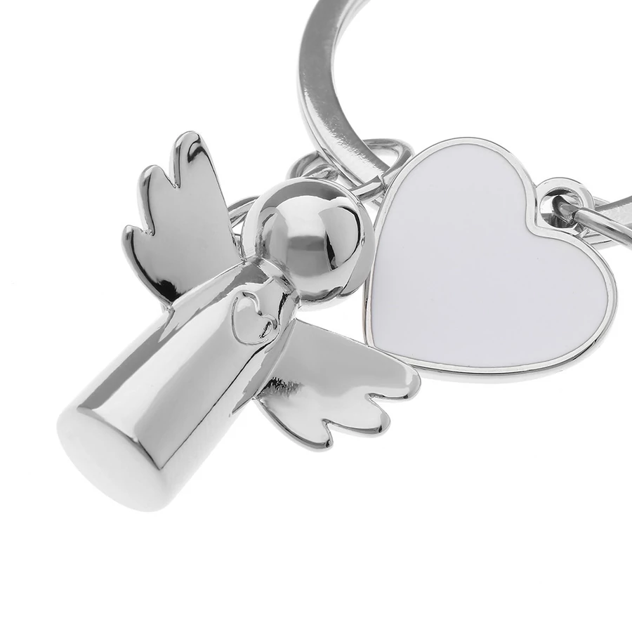 Angyal alakú, fényes ezüstszínű fém kulcstartó, szív kiegészítővel.