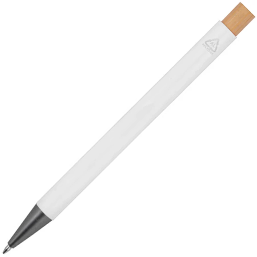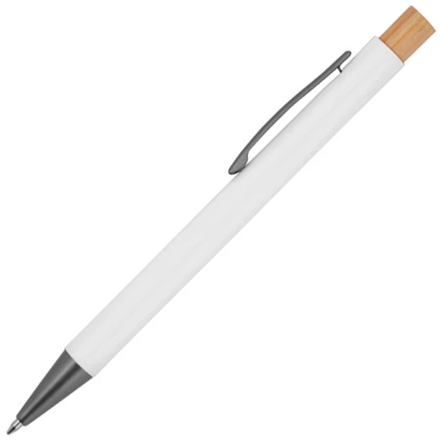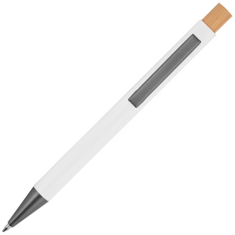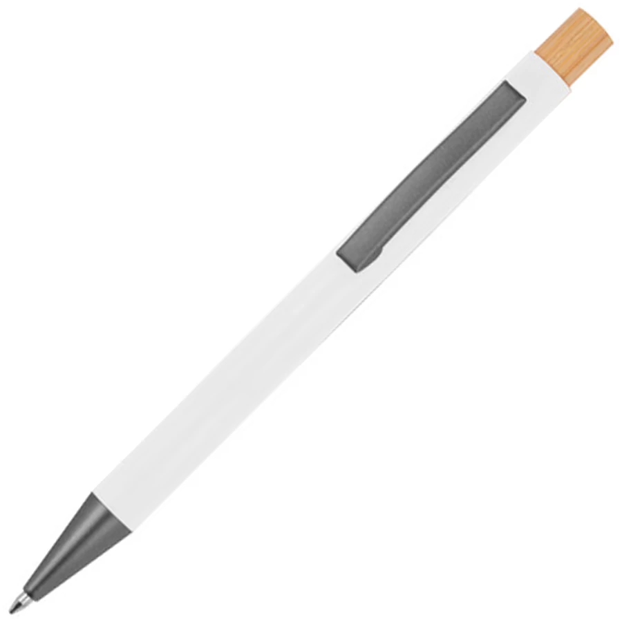 Újrahasznosított alumíniumból készült golyóstoll bambusz nyomógombbal.