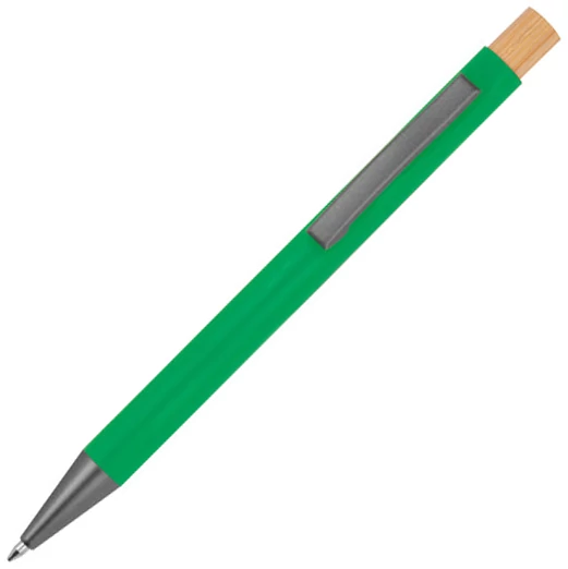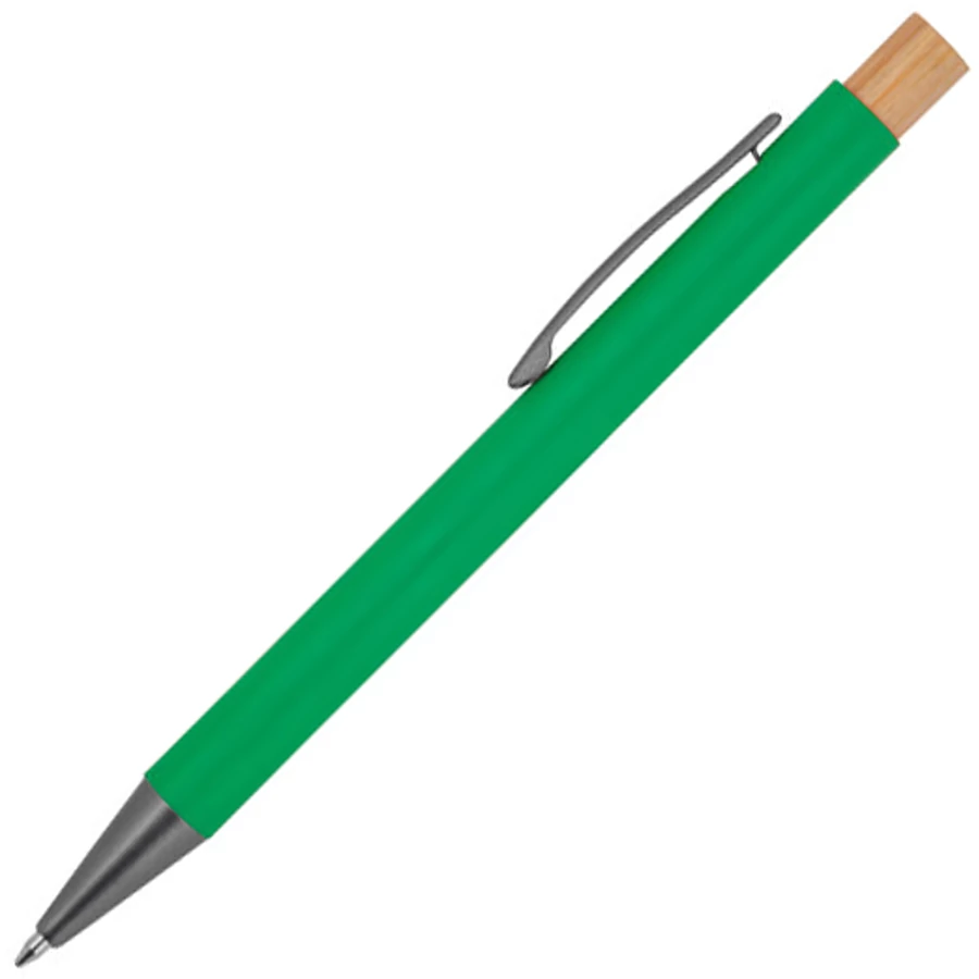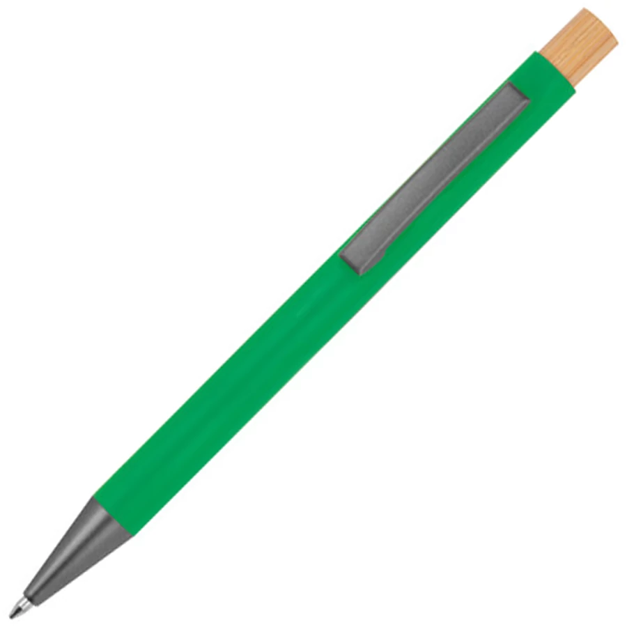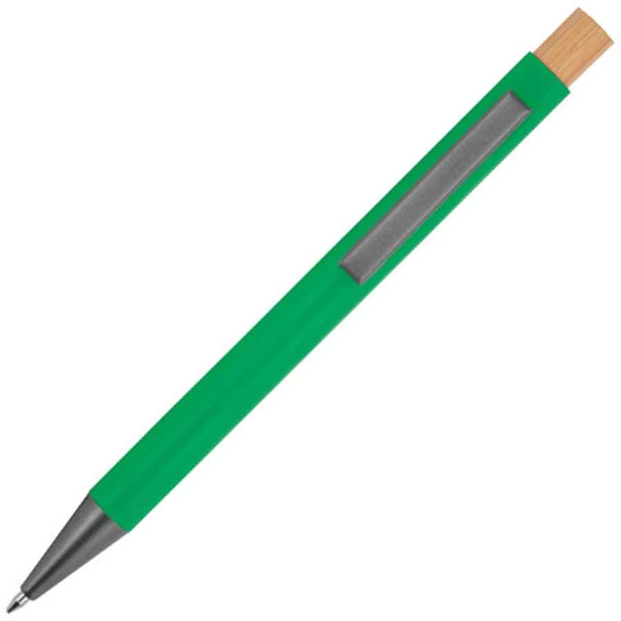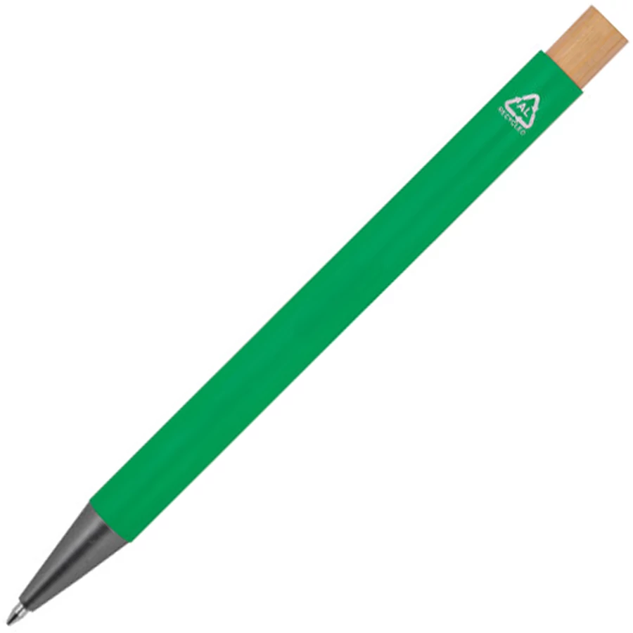 Újrahasznosított alumíniumból készült golyóstoll bambusz nyomógombbal.
