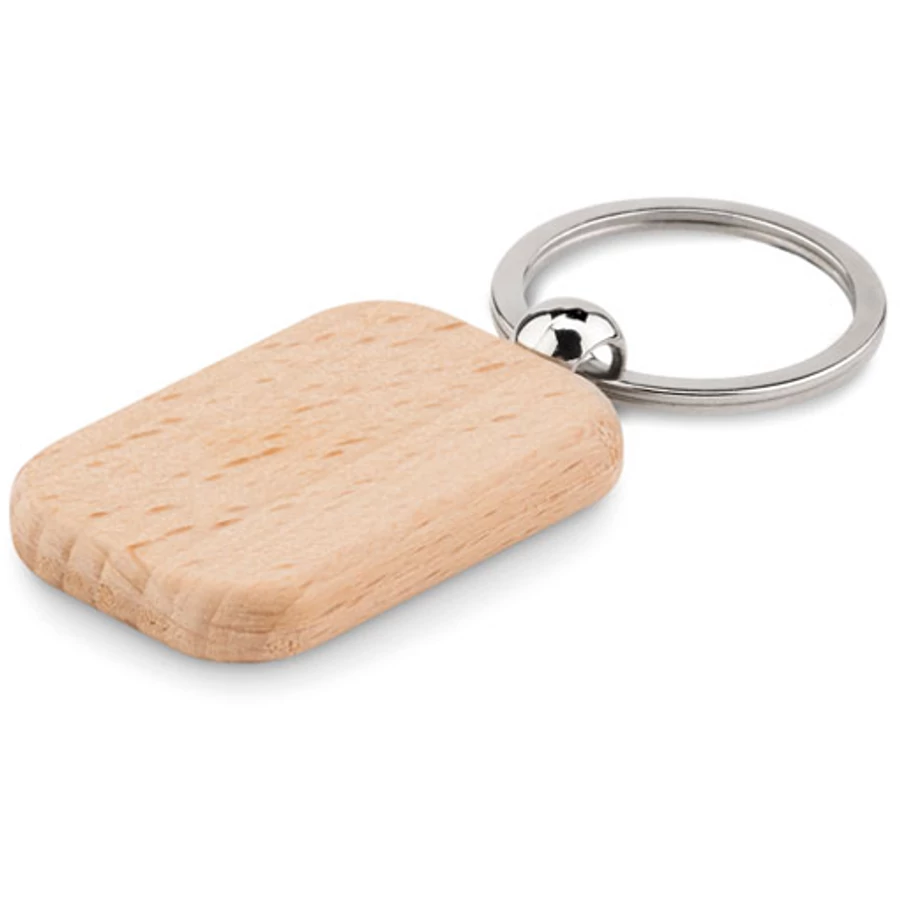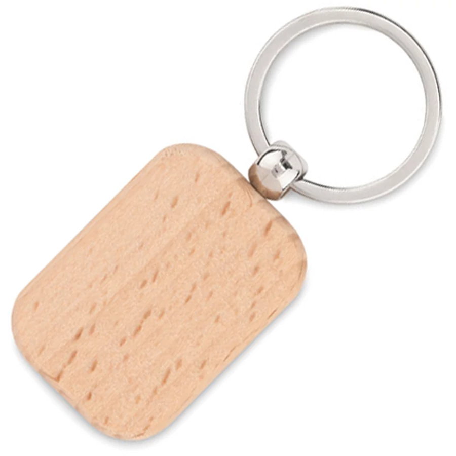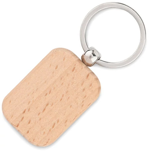 Téglalap alakú kulcstartó ezüst színű kulcskarikával és nagy fa felülettel a logózáshoz