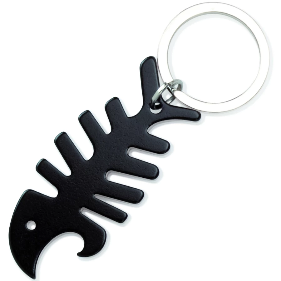 Hal formájú alumínium kulcstartó, üvegnyitó funkcióval.