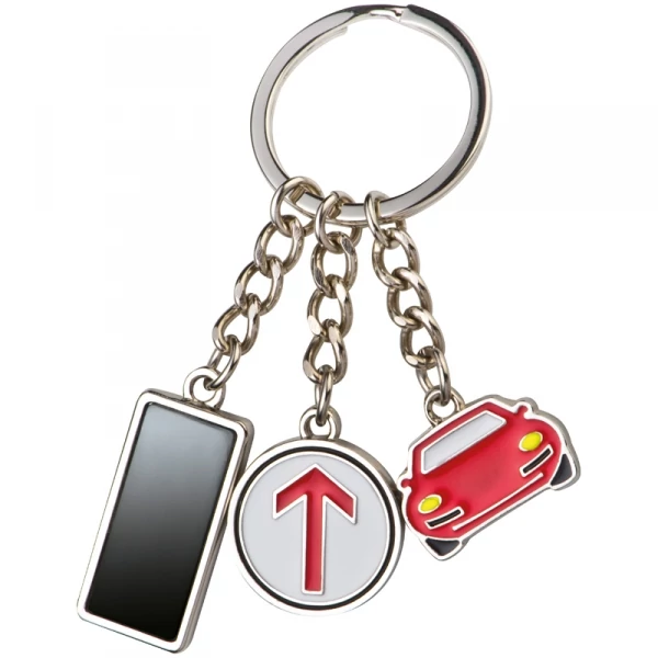 Fém kulcstartó 3 különböző függelékkel, mind a háromnak a hátsó oldala fényes, ezüstszínű.