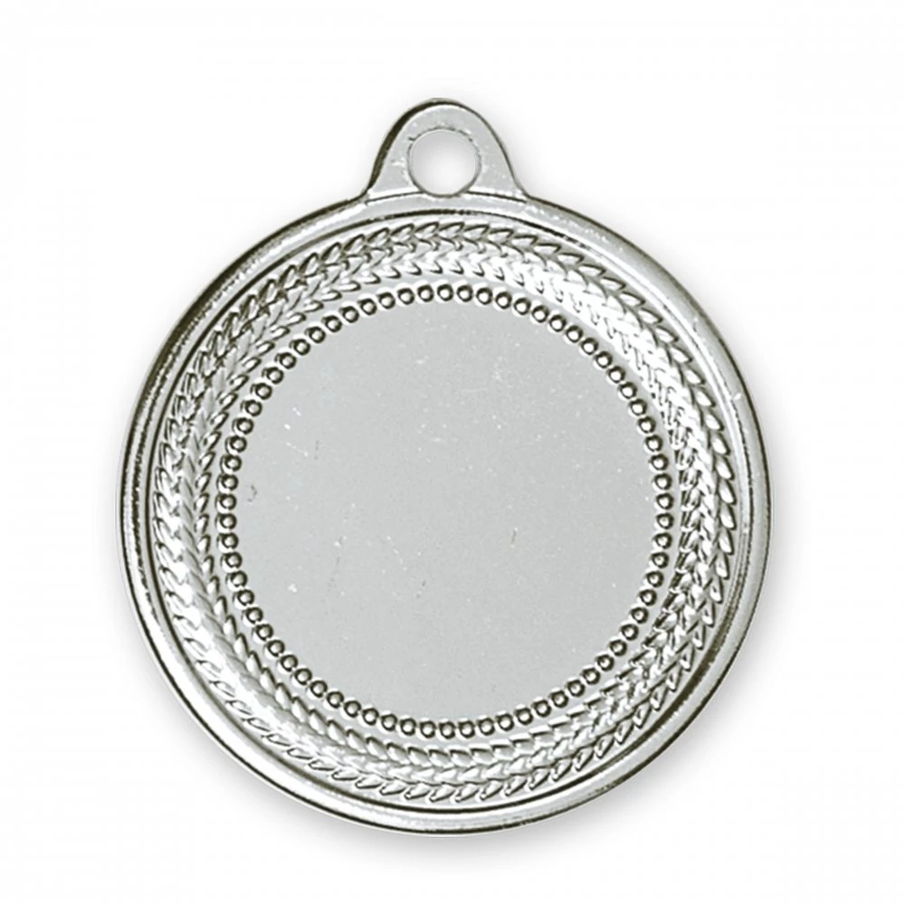 Ezüst színű kerek érem. A közepe jól gravírozható.