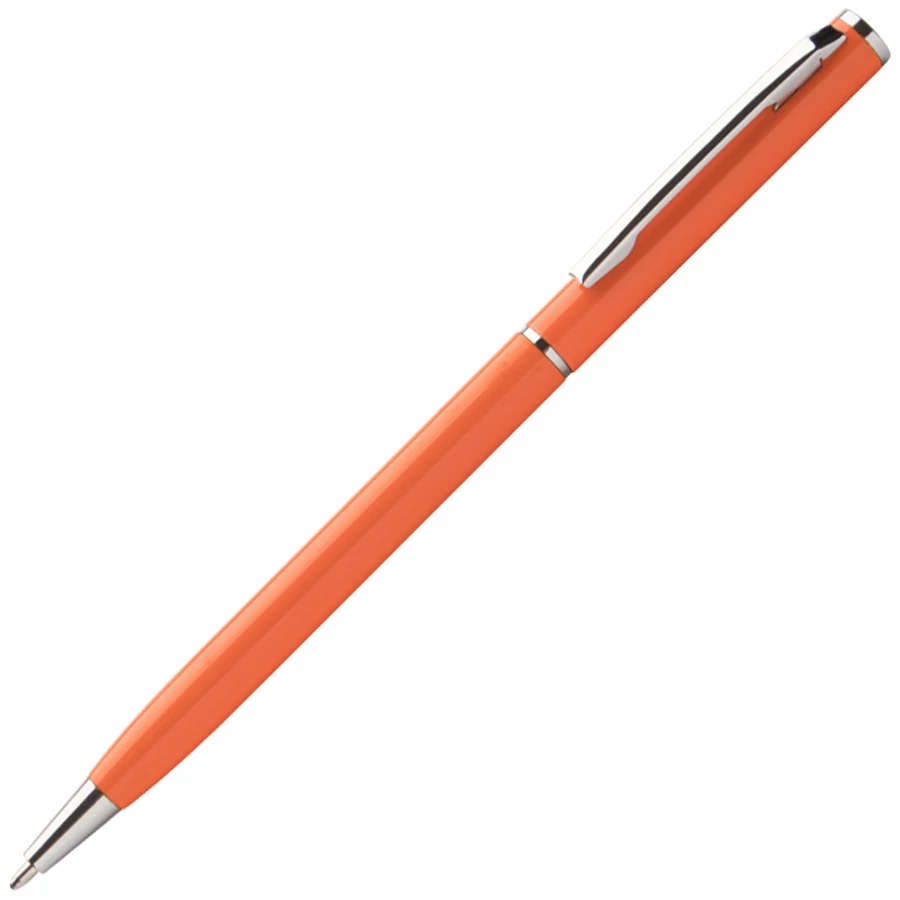 Elegáns vékony testű fém golyóstoll narancssárga színben, kék betéttel.