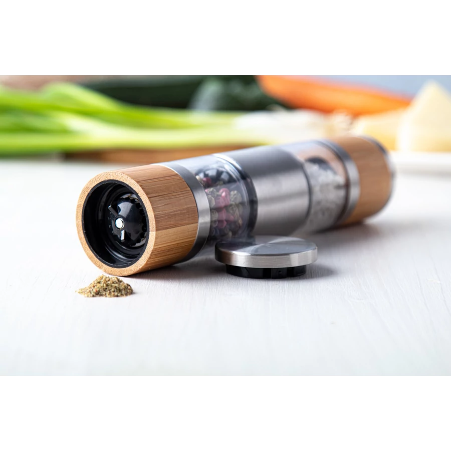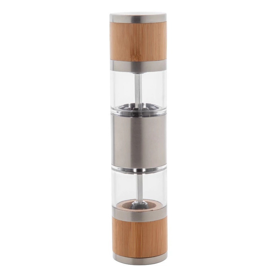 Rozsdamentes acélból és bambuszból készült kézi só és borsőrlő, kerámia őrlőszerkezettel.