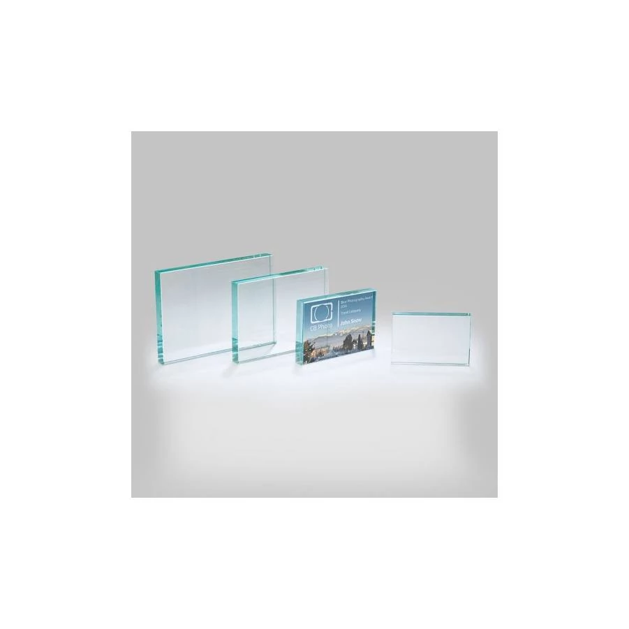 Átlátszó üveg plakett, nagy gravírozható felülettel.