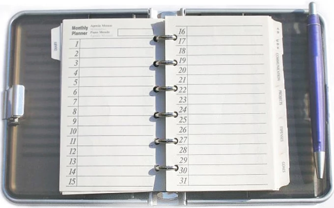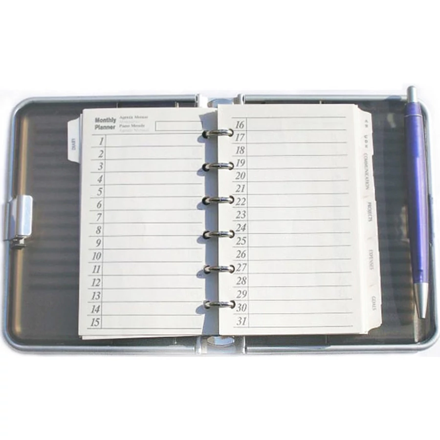 Cserélhető belső lapokkal. Heti vagy havi cserelap csomagok kaphatók az írószerboltokban.