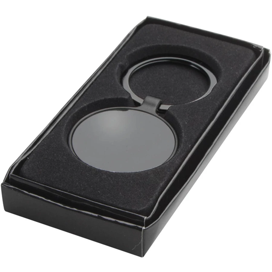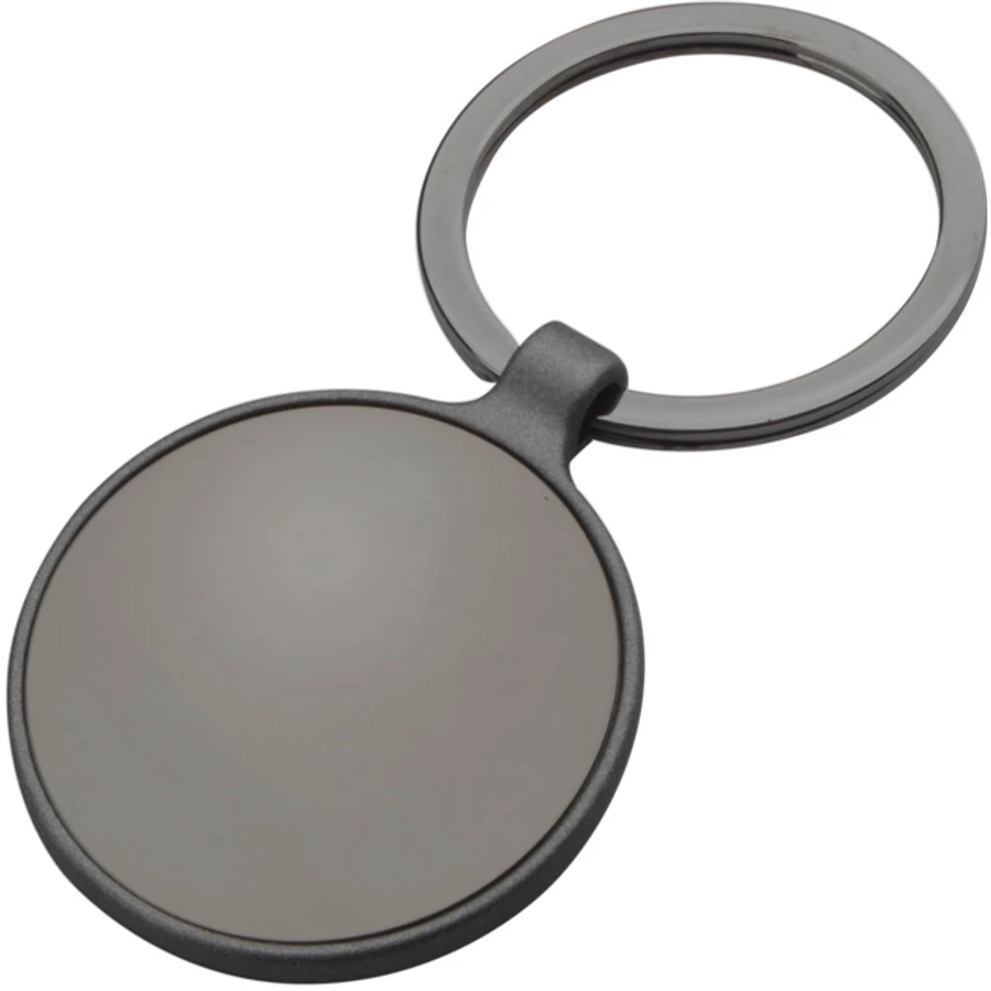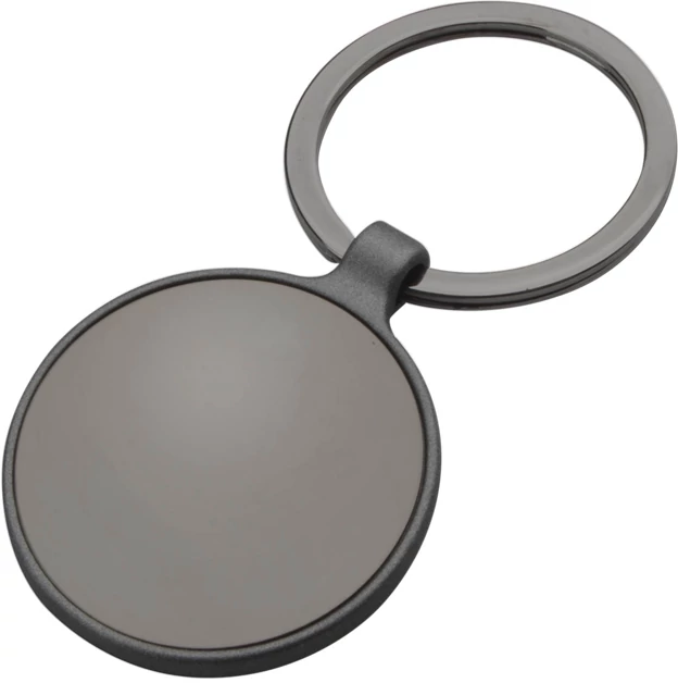 Fém, kerek kulcstartó, mindkét oldalán, antracitszínű fényes felületű fém betéttel.