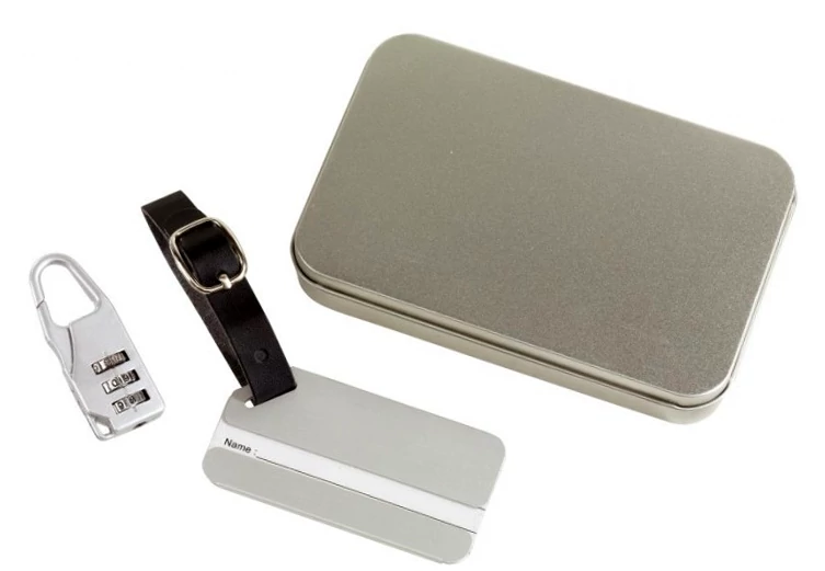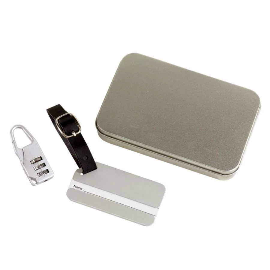 A poggyászazonosító szett tartalmaz egy alumínium poggyászazonosítót eltávolítható címkével, rögzítő szíjat, és számzáras bőrönd lakatot, karabinerrel, fém dobozban.