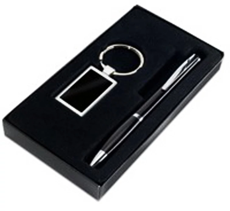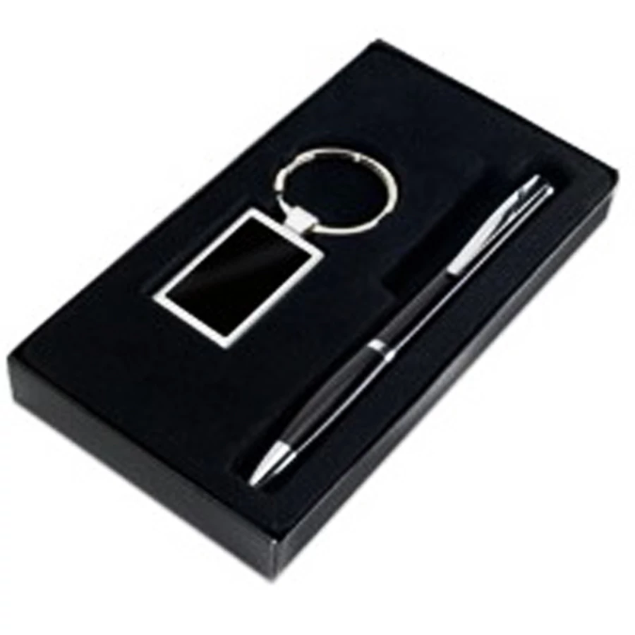 Mutatós ajándék szett díszdobozban: csavarózáras műanyag fényes golyóstoll kék tintával és alumínium kulcstartó színes berakással.