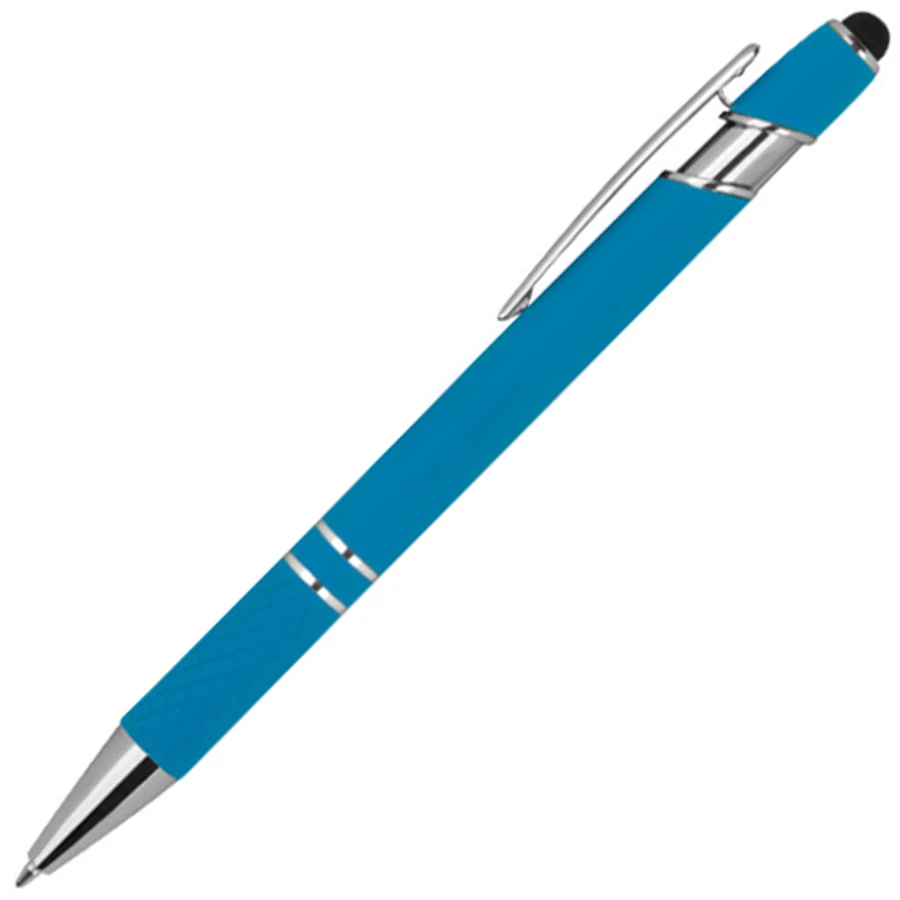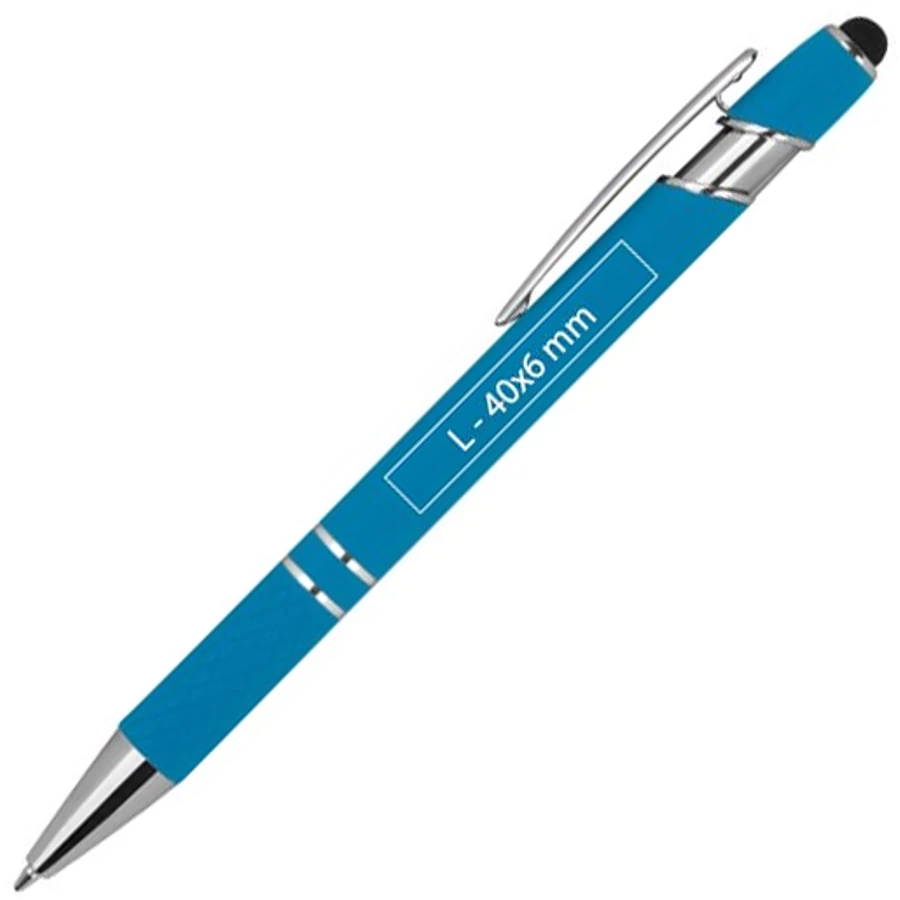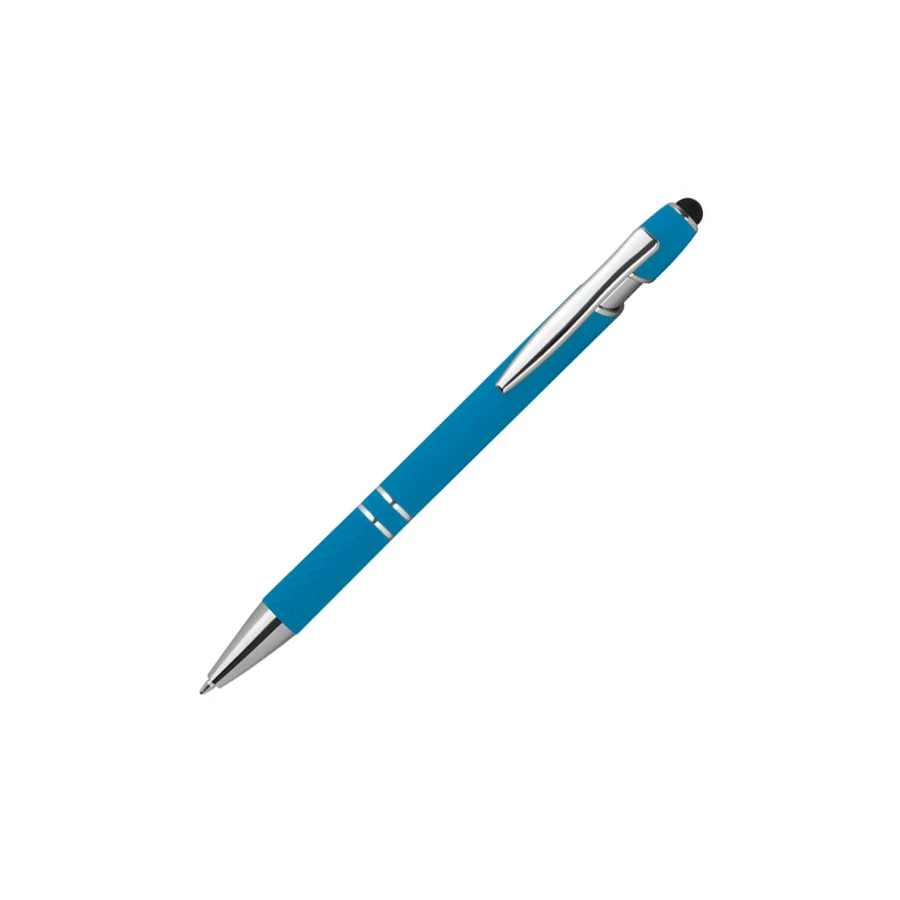 Fém gumírozott golyóstoll, ezüstszínű kiegészítőkkel, mintázott markolattal, érintőfunkcióval.