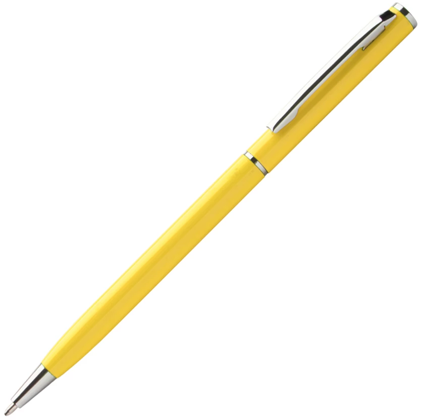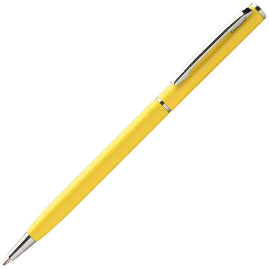 Elegáns vékony testű fém golyóstoll citromsárga színben, kék betéttel.
