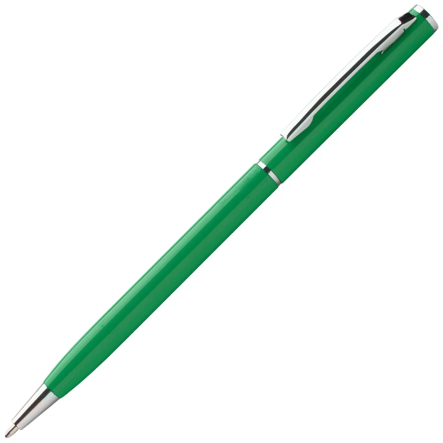 Elegáns vékony testű fém golyóstoll zöld színben, kék betéttel.