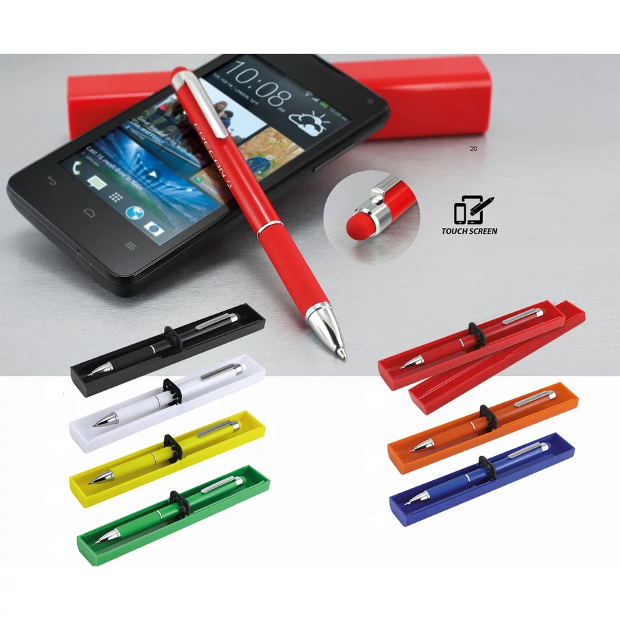 Alumínium golyótoll érintőképernyős funkcióval, a toll színével megegyező dobozban.