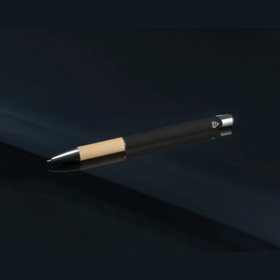 Újrahasznosított alumínium test gumírozott bevonattal, ezüst színű kiegészítőkkel és bambusz fogórésszel.