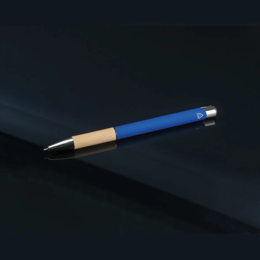 Újrahasznosított alumínium test gumírozott bevonattal, ezüst színű kiegészítőkkel és bambusz fogórésszel.
