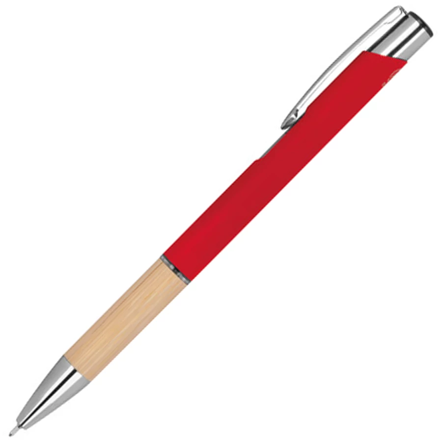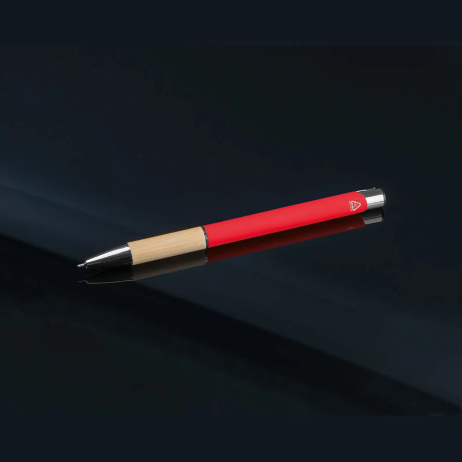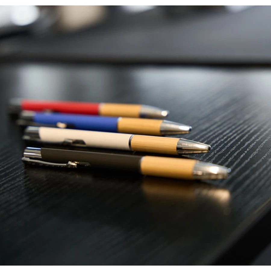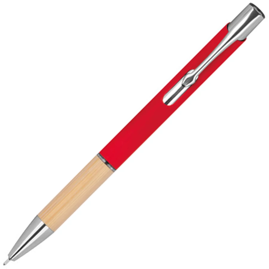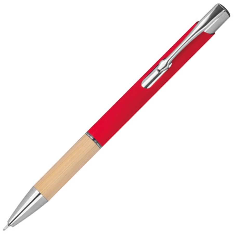 Újrahasznosított alumínium test gumírozott bevonattal, ezüst színű kiegészítőkkel és bambusz fogórésszel.