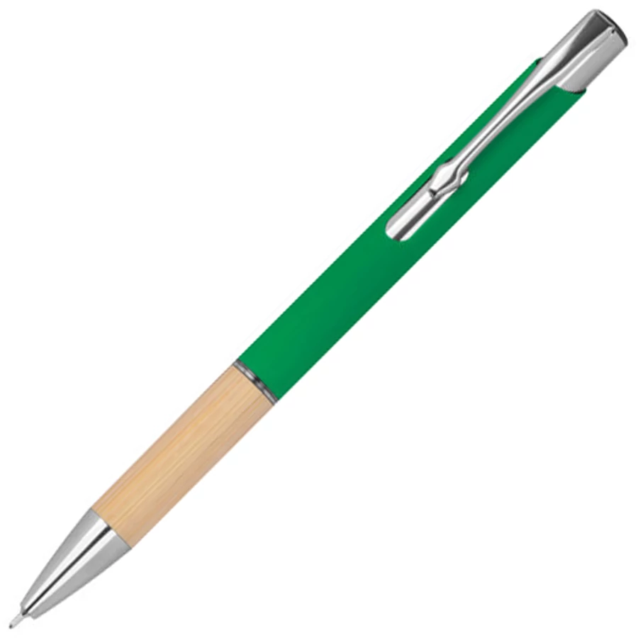 Újrahasznosított alumínium test gumírozott bevonattal, ezüst színű kiegészítőkkel és bambusz fogórésszel.