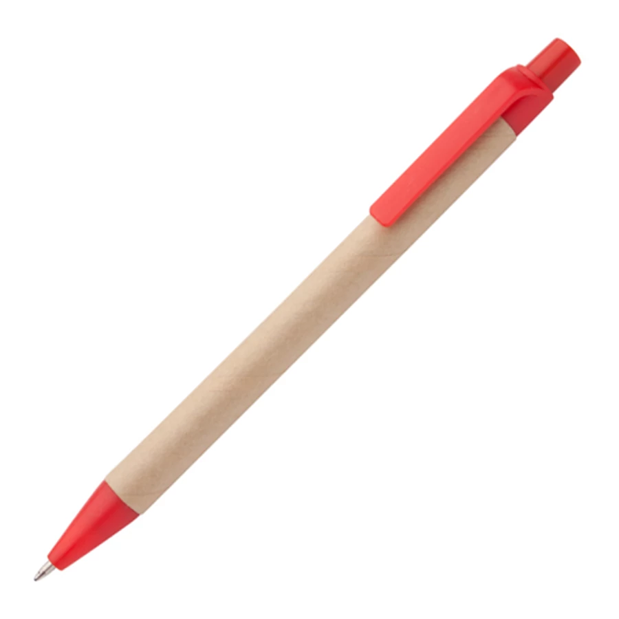 Karton golyóstoll műanyag klipsszel és piros kiegészítőkkel.