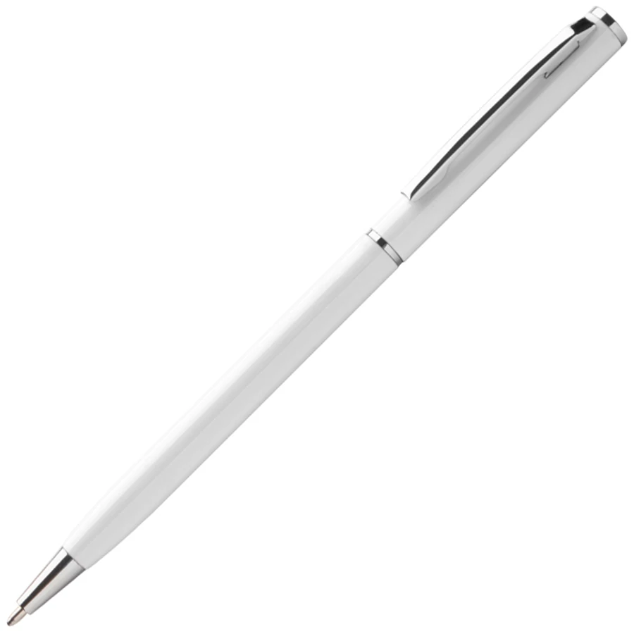 Elegáns vékony testű fém golyóstoll fehér színben, kék betéttel.