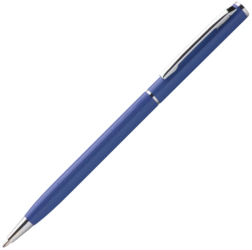 Elegáns vékony testű fém golyóstoll kék színben, kék betéttel.