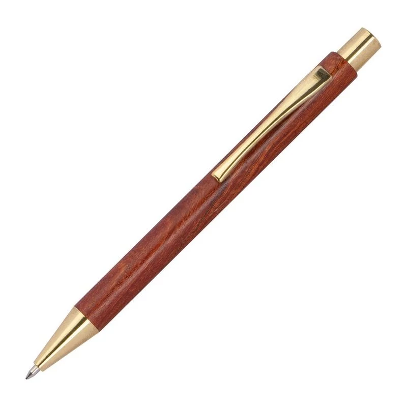 Elegáns fa testű golyóstoll, kéken író tollbetéttel és arany színű kiegészítővel.
