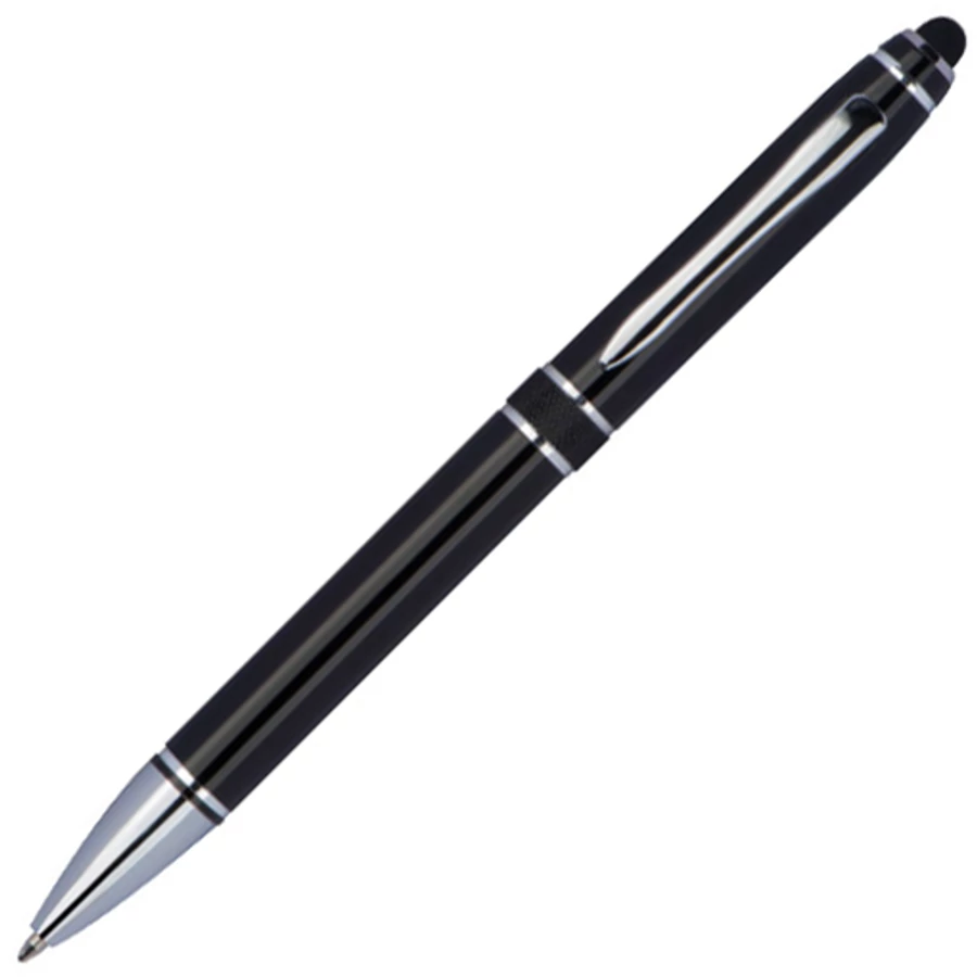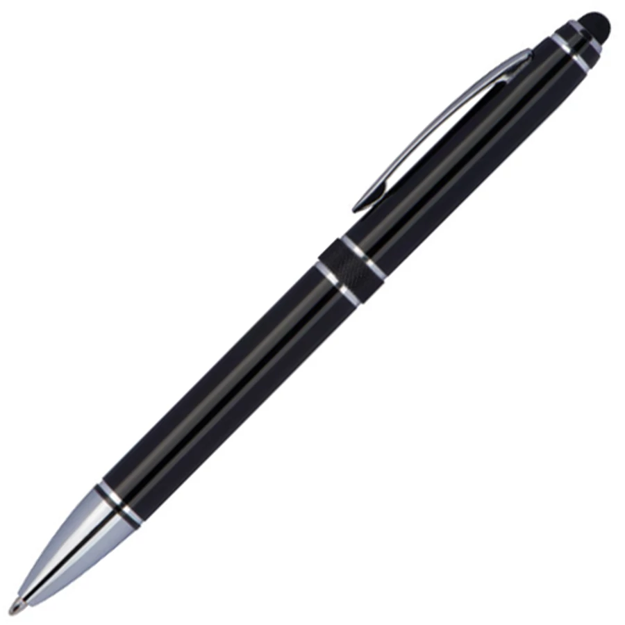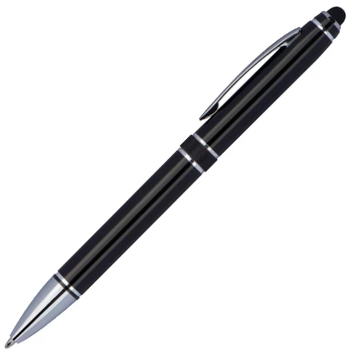 Elegáns alumínium golyóstoll csavaró mechanizmussal, kék tollbetéttel, érintő funkcióval.