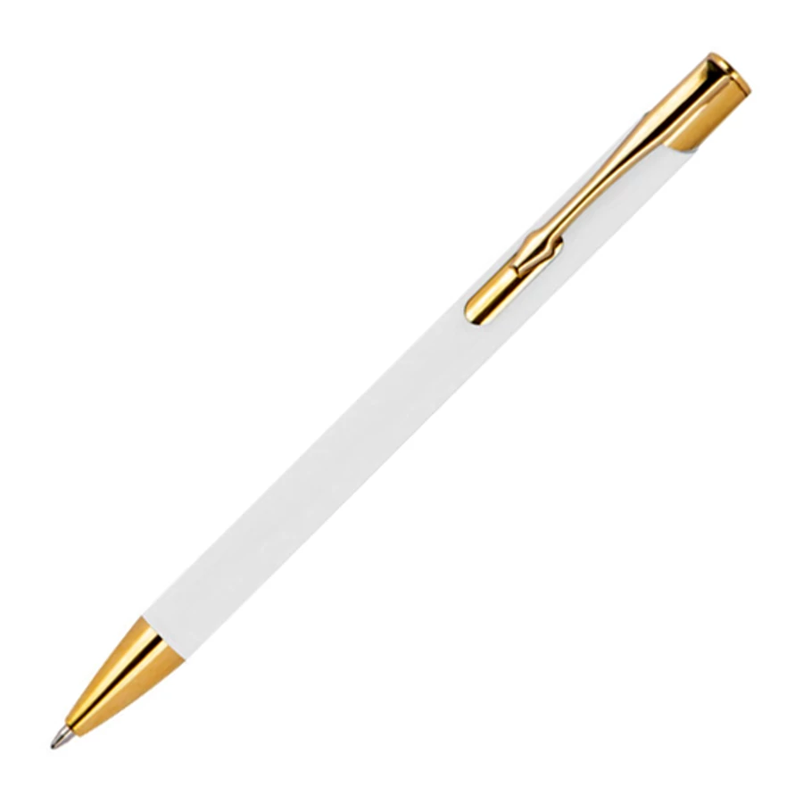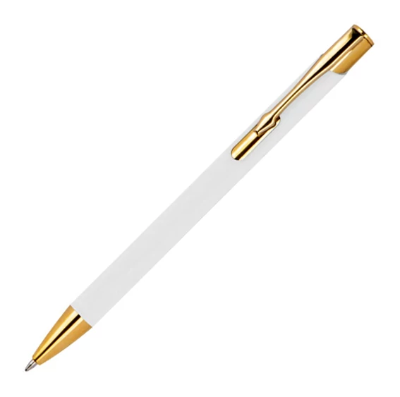 Elegáns alumínium golyóstoll, gumírozott bevonattal, kék tollbetéttel, arany színű kiegészítőkkel.