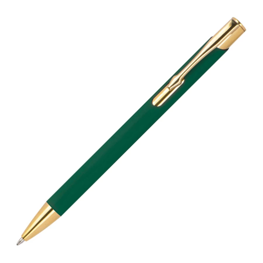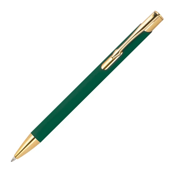 Elegáns alumínium golyóstoll, gumírozott bevonattal, kék tollbetéttel, arany színű kiegészítőkkel.