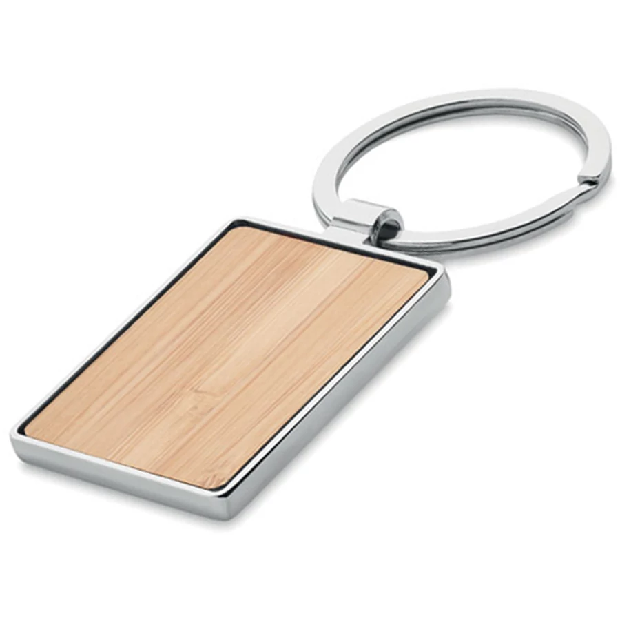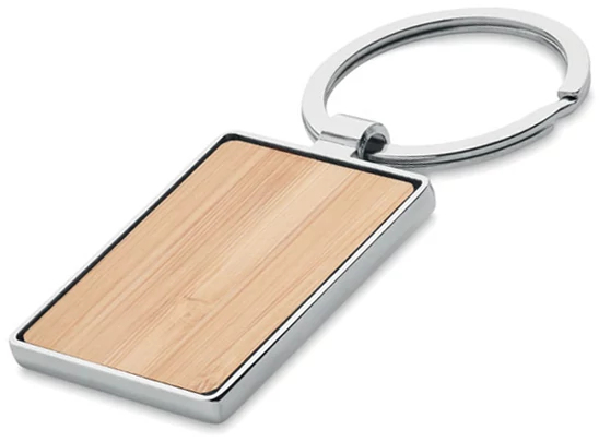 Téglalap alakú cink ötvözet kulcstartó bambusz előlappal.