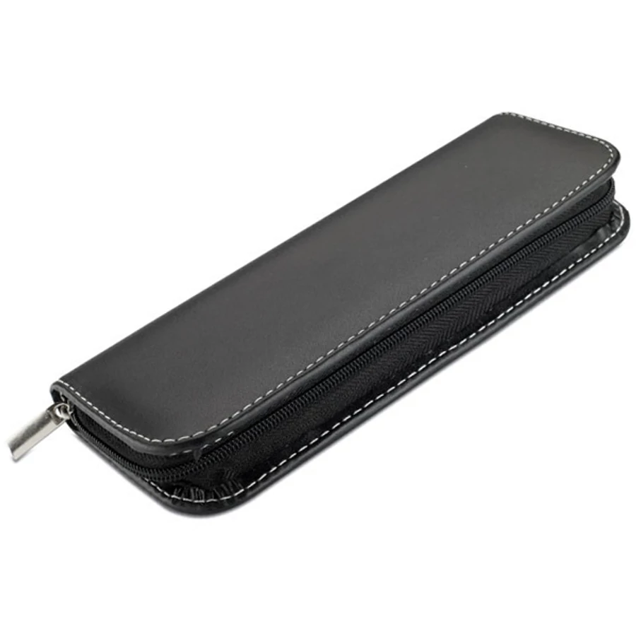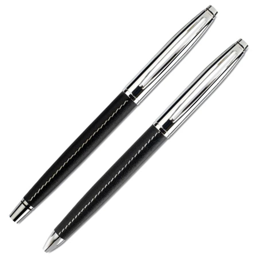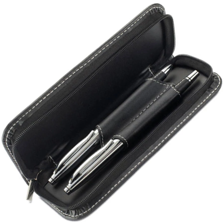 Golyóstoll és roller toll szett cipzáras PU bőr tokban, kontrasztos varrással.