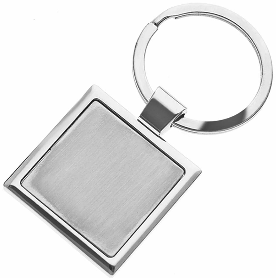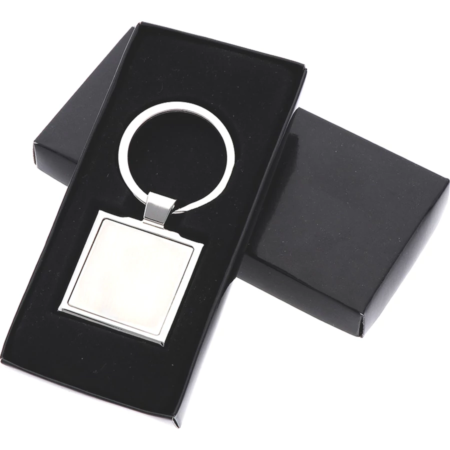 Négyzet alakú fém kulcstartó, fém kulcskarikával.