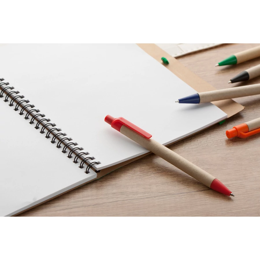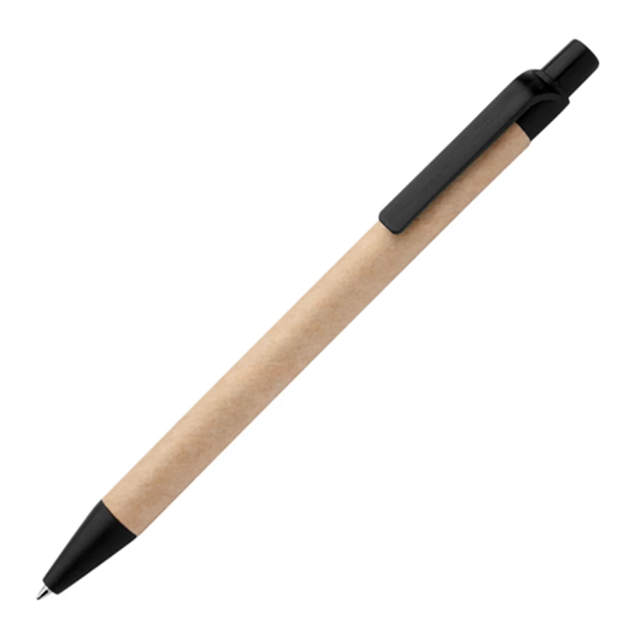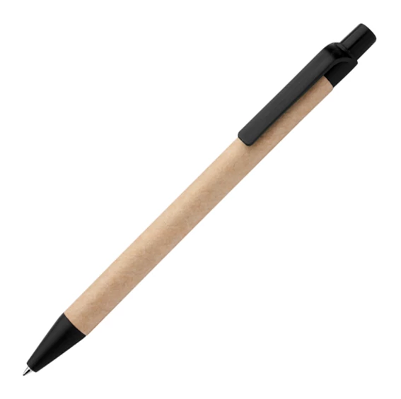 Karton golyóstoll műanyag klipsszel és fekete kiegészítőkkel.