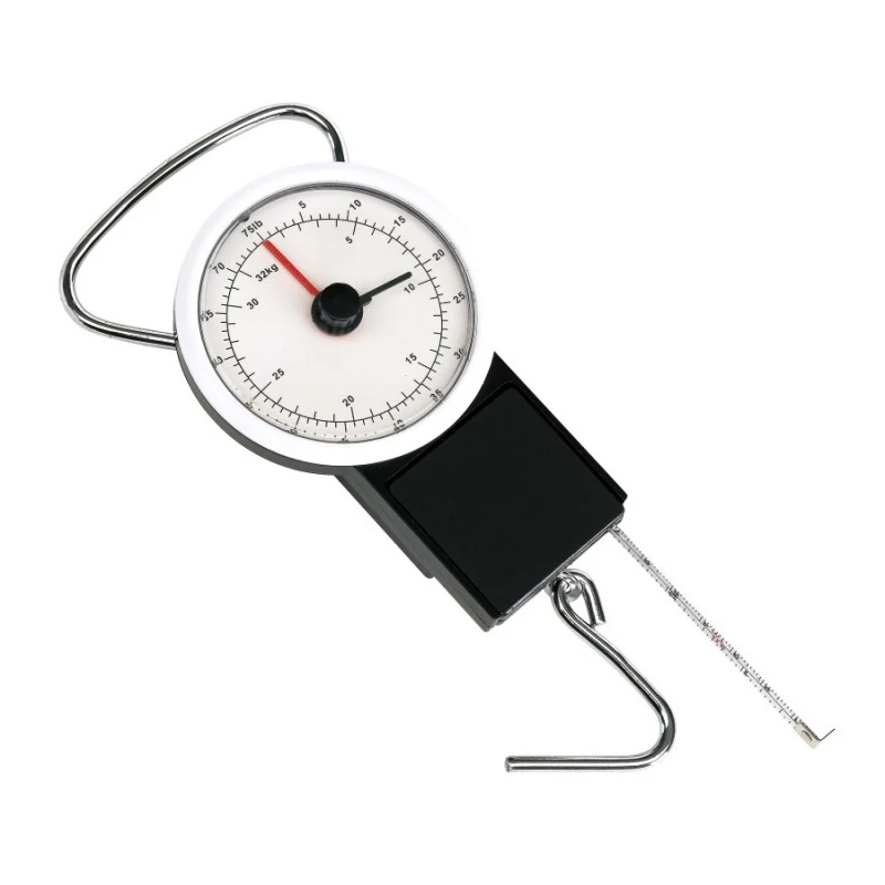Kézi poggyászmérleg, mérőszalaggal (1m), 32 kilogrammig mér, otthoni használatra.