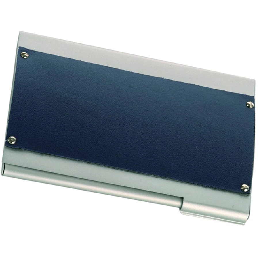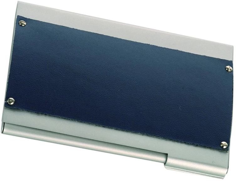 Valódi bőrrel díszített, matt ezüst színű névjegytartó.