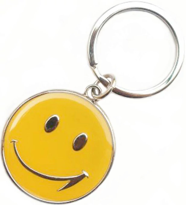 Fém kulcstartó, amelynek egyik oldala egy smile fej, másik oldala pedig sima fényes, jól gravírozható.