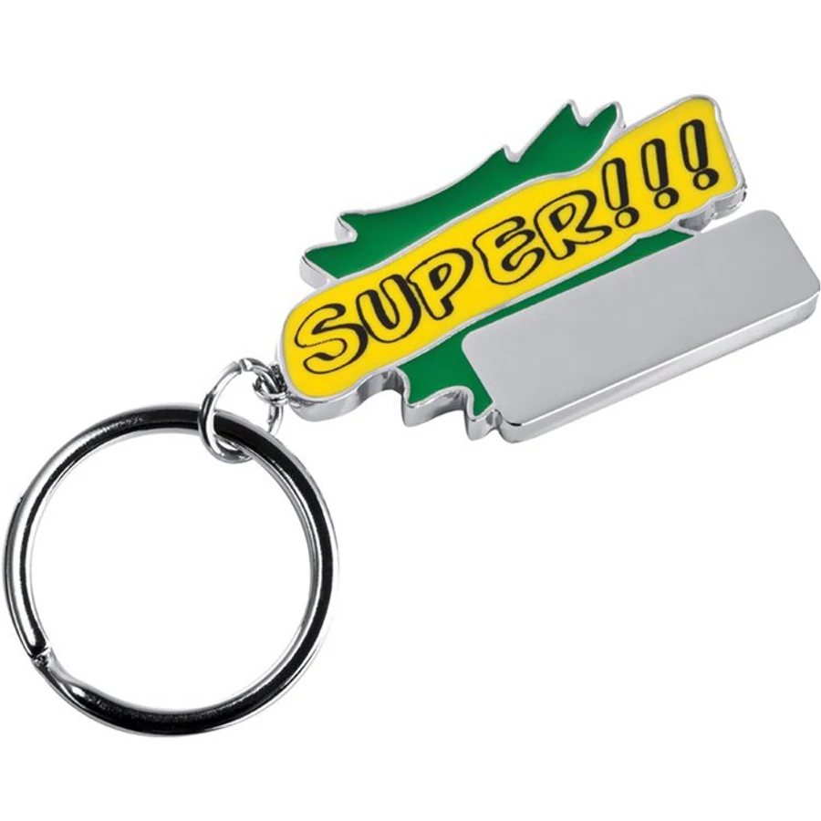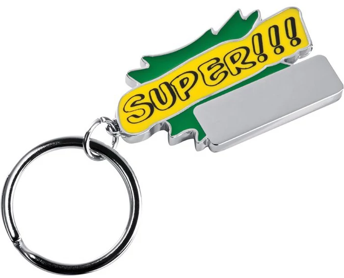 "SUPER" feliratos fém kulcstartó, színes festett és sima gravírozható felülettel.