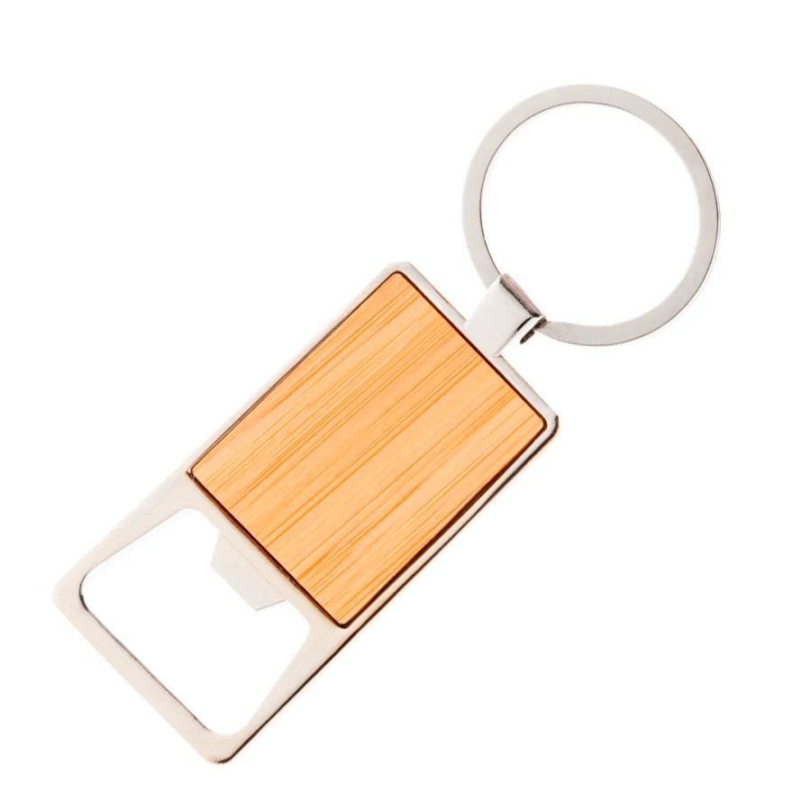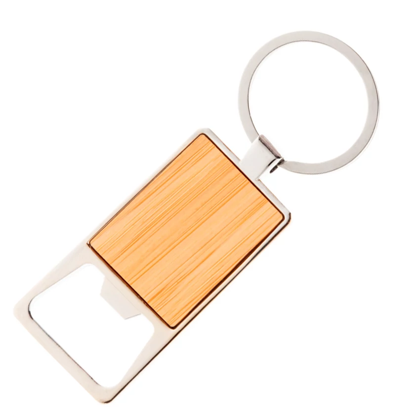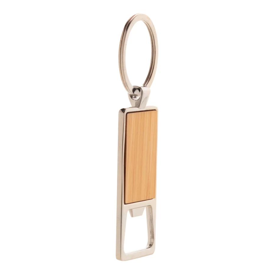 Fém kulcstartó bambusz betéttel és üvegnyitóval.