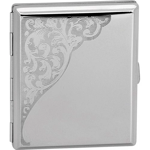 Fényes ezüst színű tárca, 20 szál normál cigaretta fér el benne, gumi lefogóval.