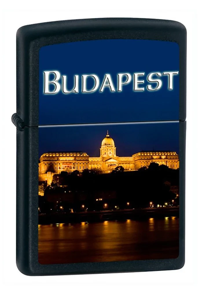 Egy fekete matt öngyújtón a Budai Vár látható Budapest felirattal.