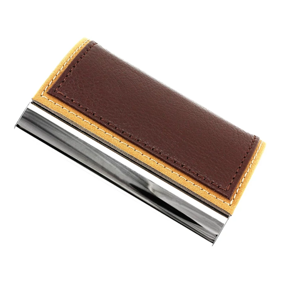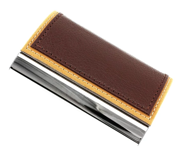 Rozsdamentes acél és műbőr névjegykártya tartó.