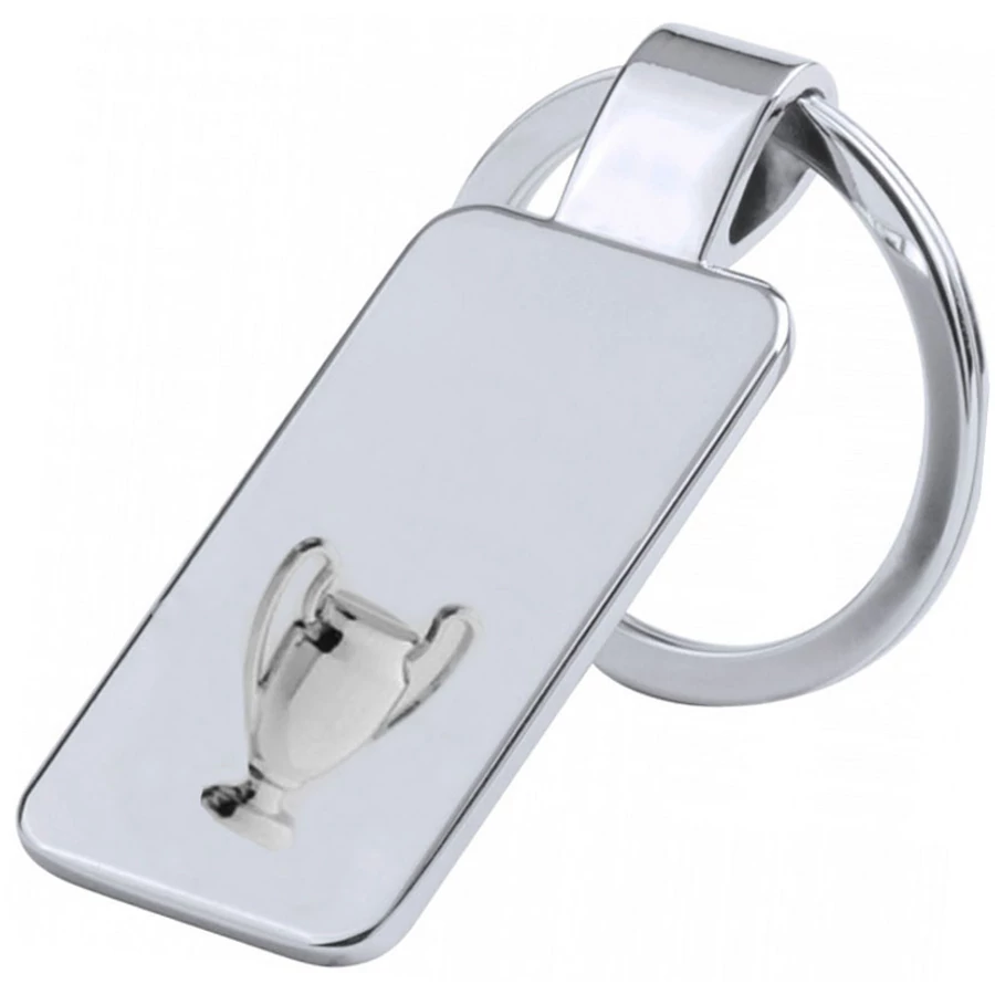 Fényes ezüst színű fém kulcstartó, serleg motívummal az alján.