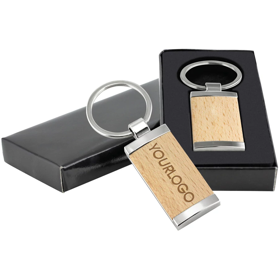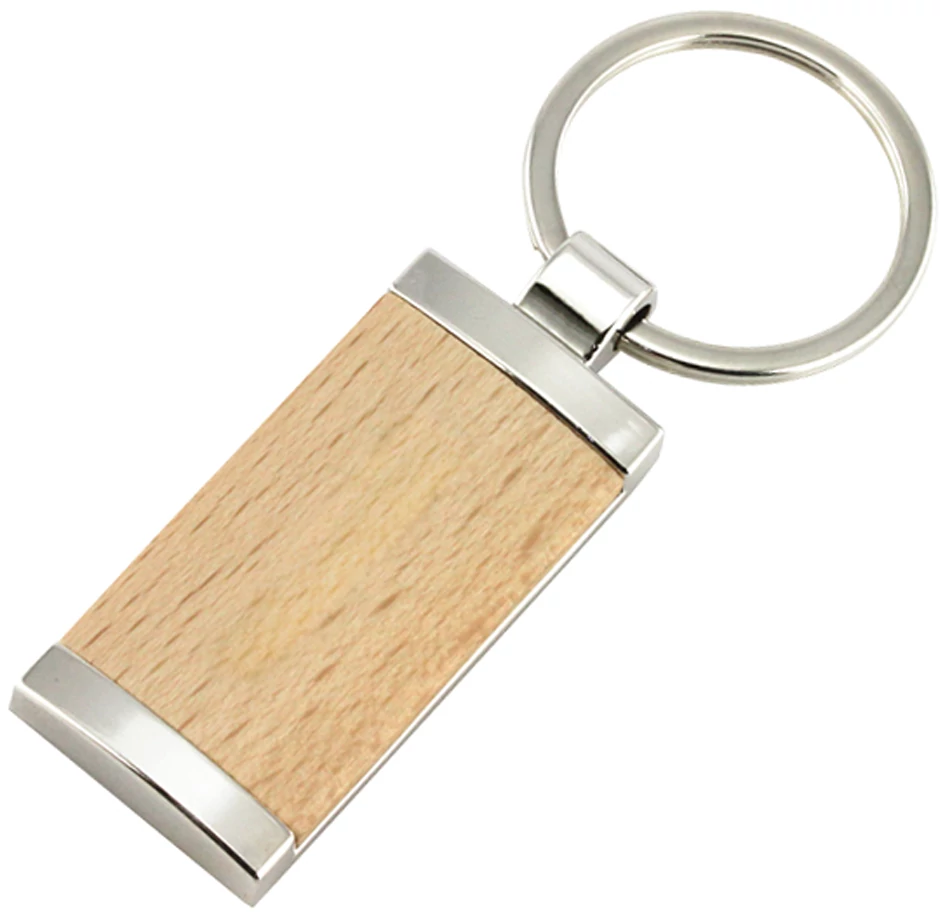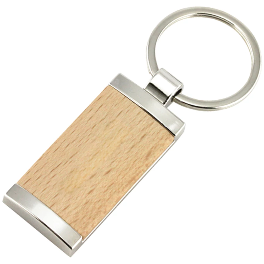 Téglalap alakú fém kulcstartó fa díszítéssel, fém kulcskarikával.