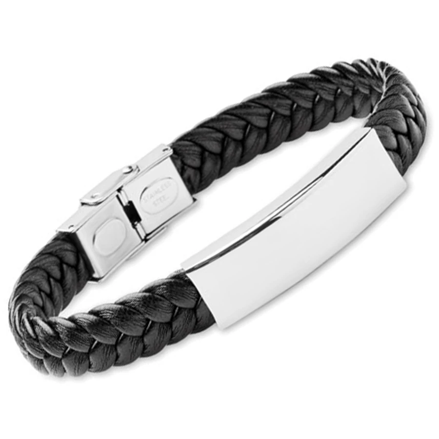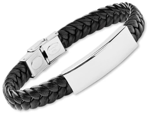 Fonott műbőr karkötő, polírozott acél részletekkel.