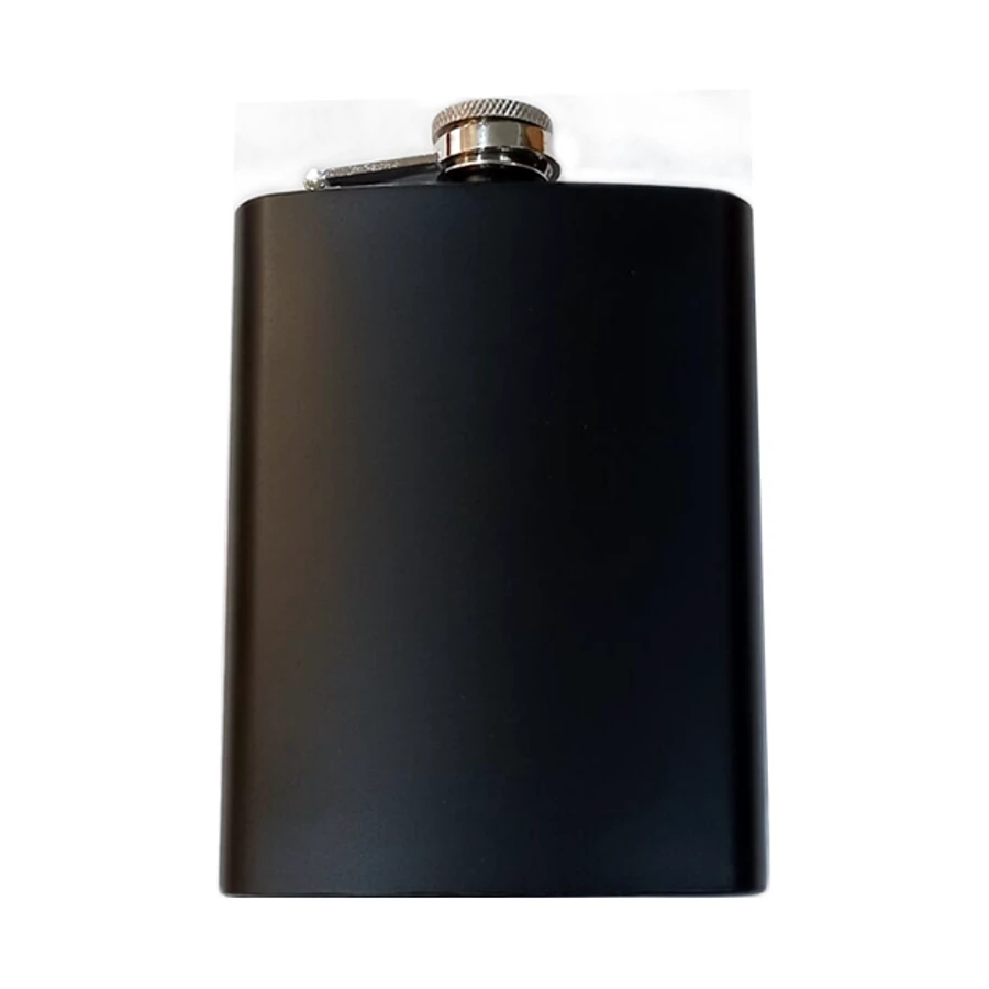 Matt, fekete színű, alkoholos italok tárolására alkalmas rozsdamentes acél flaska.
