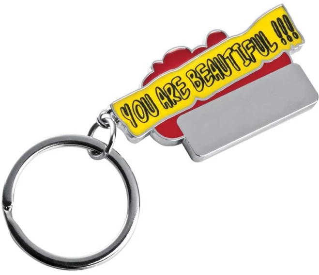 "You Are Beautiful" feliratos fém kulcstartó, színes festett és sima gravírozható felülettel.