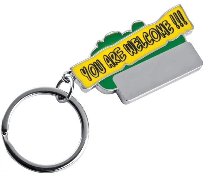 "You Are Welcome" feliratos fém kulcstartó, színes festett és sima gravírozható felülettel.