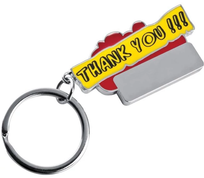 "Thank You" feliratos fém kulcstartó, színes festett és sima gravírozható felülettel.