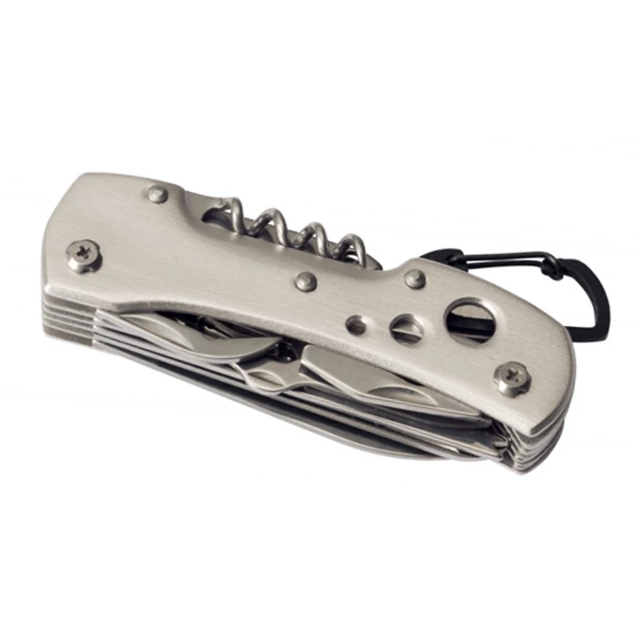 12 részes zsebkés: kés, fűrész, olló, konzervnyitó, csavarhúzó, üvegnyitó és hornyos csavarhúzó, csillagcsavarhúzó, lyukasztó és lyuktágító, varró eszköz, halpikkelyező, körömreszelő és karabiner.